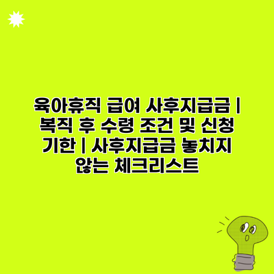 육아휴직을 이용한 많은 부모들이 급여를 받지 못하고 복직 후에도 어려움을 겪는 경우가 많아요. 육아휴직 급여 사후지급금에 대한 이해는 이러한 문제를 예방하는 중요한 요소입니다. 이번 블로그 포스트에서는 육아휴직 급여 사후지급금의 개념, 복직 후 수령 조건, 신청 기한, 그리고 사후지급금을 놓치지 않기 위한 체크리스트를 상세히 설명할게요.